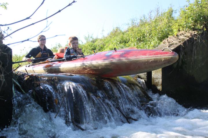 Obwohl die Angel tief zwischen Feldern herfließt, war die Fahrt zeiemlich kurzweilig. Mal sorgten kleine Sohlschwällen für Abwechslung, mal Baumhindernisse (auf den letzten  2 km vermehrt), mal die abwechslungsreiche Tierwelt. Wir haben Eisvögel, eine Bisamratte, diverse Enten, einen Fasan und sogar ein Reh von ganz nah gesehen. Samuel war begeistert. Für Jakob war es auch so spannend, dass er kaum geschlafen hat.