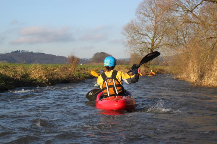 Kurze Zeit später mündet von rechts die Leisse in die Wenne, sie bringt noch mal einiges an Wasser und man kann auch hier einsteigen. Das darauf folgende Wehr macht bei sehr hohen Wasserständen besonders viel Spaß, war bei unserem Pegel (ca. 75 cm) auch lohnenswert. Man kann hier entweder rechts über einen Kicker boofen oder den Höhenunterschied links über eine schräge Platte und einer kleineren Stufe abbauen.