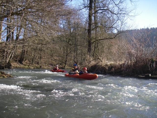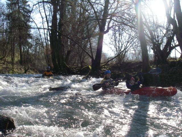 In Berge folgt noch ein Steilwehr, dass man zur Zeit wegen Umbauarbeiten umtragen muss (gibts leider keine Fotos von). An einer Stufe einige hundert Meter später, kriegt Samuel ganz schön Wasser ab und so langsam wirds ihm kalt (da war die Februarsonne leider noch nicht stark genug). Deshalb entschließen wir uns auch, die Rücklaufstufe, die kurz danach kommt, links über eine Art Fischtreppe zu umfahren. Da wird man zwar nicht nass, leicht zu fahren ist es bei dem Wasser allerdings auch nicht, weil es zwischen den Bäumen hergeht.