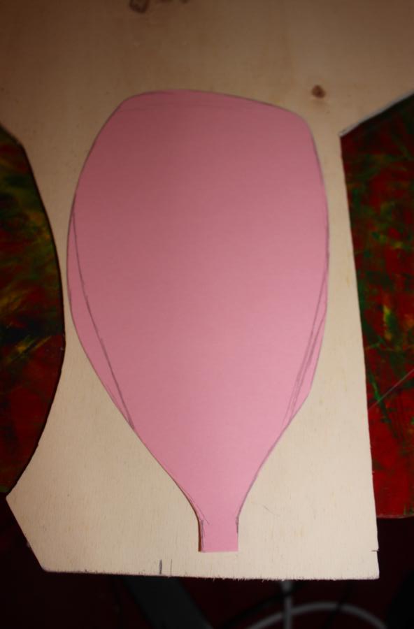Zunächst einmal malt man die Umrisse des Paddelblatts auf die Pappe. Dafür kann man Bilder von Paddeln aus Katalogen oder Zeitschriften als Vorlage nehmen. Als grobe Angabe für die Größe: das Blatt ist ca. 28 cm x 14 cm.
