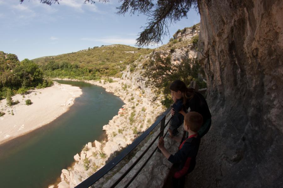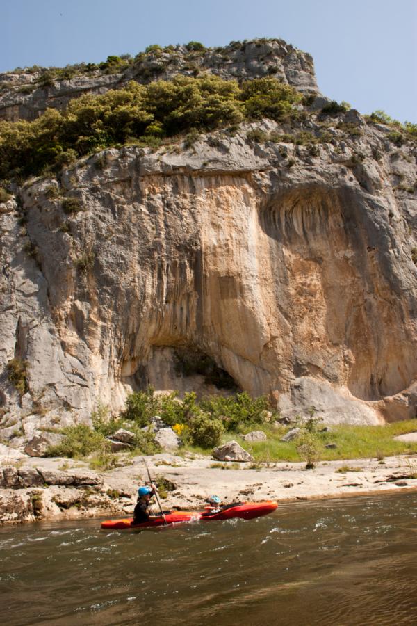 Es wurde für die Kinder zumindest nicht langweilig. Ein paar Leihbootfahrer waren auch unterwegs, aber die konnten wir immer recht zügig überholen. An der Grotte de Baume stiegen wir aus um sie uns anzuschauen. Leider mussten wir feststellen, dass sie nur zu bestimmten Zeiten für Besucher freigegeben ist, da in ihr eine seltene Fledermausart lebt. Dafür hatten wir vom Eingang der Höhle aus einen super Blick von weit oben in die Schlucht.