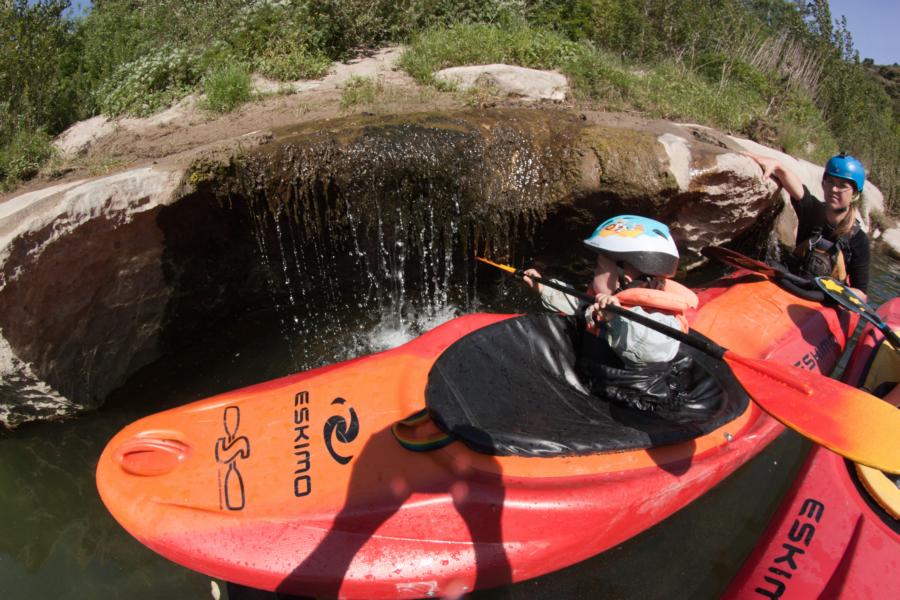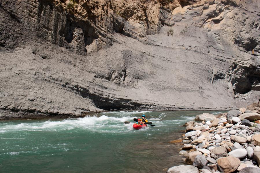 12 Kilometer paddelten wir durch das offene Tal bis sich das Flussbett zur Schlucht verengte. Die erste Stelle der Schlucht ist etwas schwieriger, man erkennt sie gut an der Hängebrücke, die sie überspannt. Mit Jakob wollte ich sie nicht fahren, also machten wir dort kurzerhand Pause und umtrugen sie gleichzeitig auf der rechten Seite, was ziemlich einfach über die Kiesbank ging.