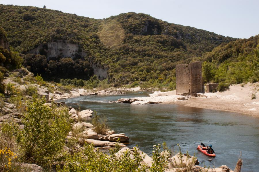 Wir hatten direkt am Ausstieg des Gards übernachtet, so dass wir am Morgen nur noch zum Einstieg hochfahren mussten. Wobei es nicht so leicht war, in Pont St. Nicholas einen guten Einstieg zu finden. Nach ein bißchen schweißtreibender Schlepperei (es war schon sehr warm), ging es dann endlich aufs Wasser. Die Schlucht des Gards ist sehr schön und auch nicht besonders schwer. Nach jedem kleinen Schwall folgt eine mehr oder weniger lange Flachwasserpassage. Dafür hat man viel Zeit, sich das Formenspiel der Felsen anzugucken.