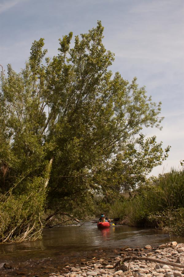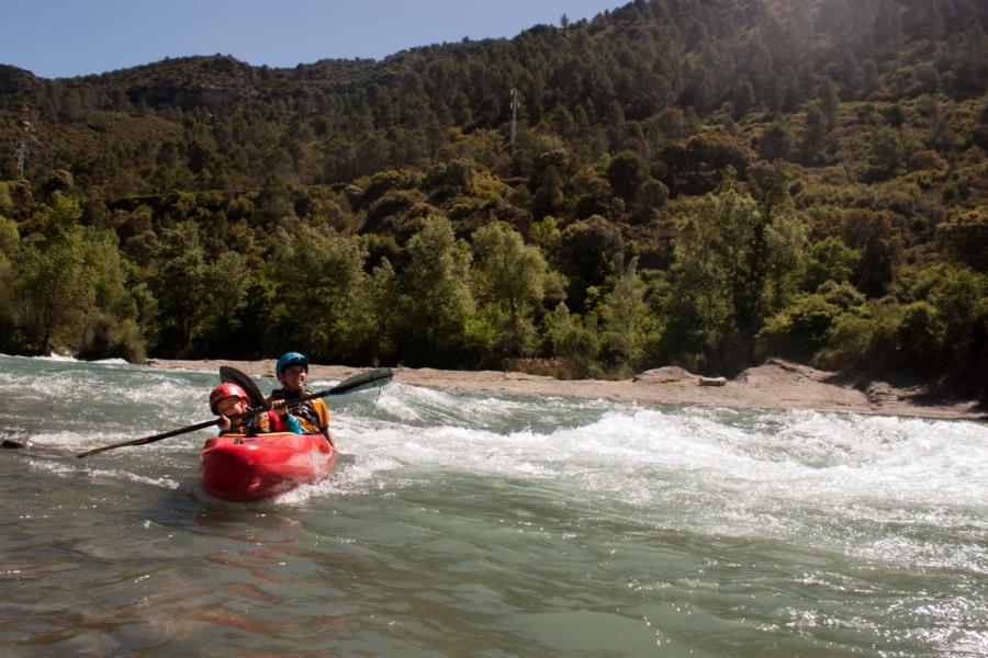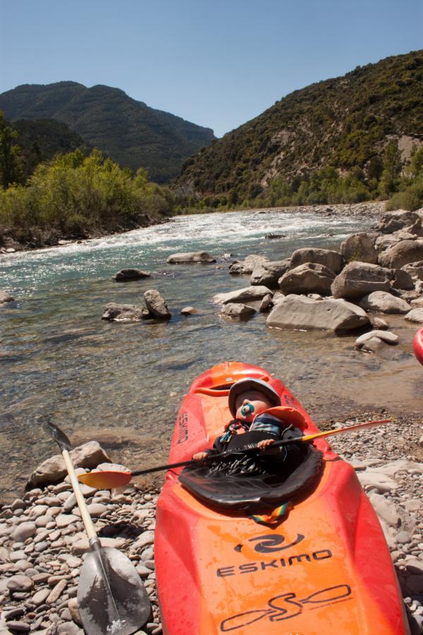 Am nächsten Morgen ging es dann also auf den Ara. Wir starteten oberhalb der Schlucht in dem kleinen Örtchen Fiscal. Der Wasserstand war nicht berauschend, aber es ging noch. Von den Schwierigkeiten her war es relativ leicht, ähnlich wie in der Schlucht bis WW II. Bei höheren Wasserständen lauert aber sicher auch mal eine dreier Stelle. Paul und Samuel machten diesmal die Vorfahrer, während Jakob und ich langsam hinterher zuckelten (damit Jakob nicht allzu nass wird). Jakob schlief fast direkt ein, nur um zehn Minuten später an einem kleinen Schwall wieder aufzuwachen. Danach fand er dann keine ruhige Minute mehr. Entweder ging es auf dem Fluss wild hinab oder er musste die vielen Milane, die über uns hinwegschwebten, beobachten.