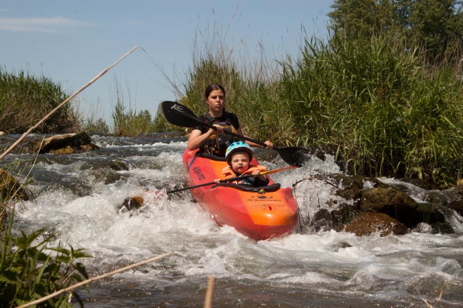 Am Ortsanfang kam dann noch ein Wehr, das man entweder ganz rechts oder links fahren kann. Da bei beiden Möglichkeiten die Kinder ziemlich nass geworden wären, entschieden wir uns fürs umtragen (vor allem da Jakob noch am schlafen war).