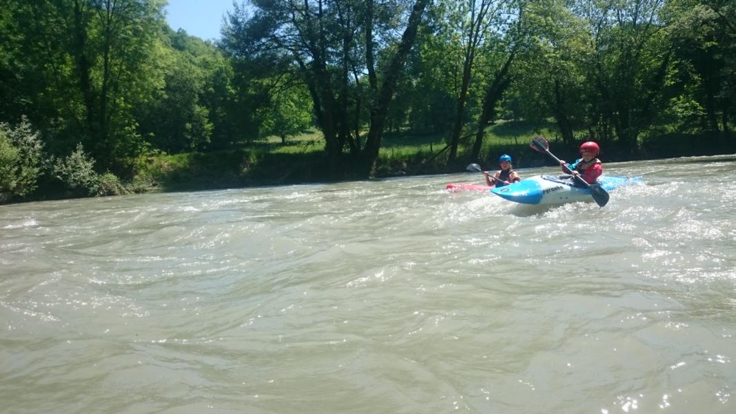 An der ersten Eisenbahnbrücke ist ein zerfallenes Wehr mit einem wuchtigen Schwall (WW II+), hier fuhr ich mit Samuel zur Sicherheit im Päckchen runter. Danach fliesst die Garonne durch eine Art Waldschlucht, schön einsam und paddeltechnisch für kleine Wildwasseranfänger schon etwas schwieriger. Die Wellen wurden höher und an den zahlreichen Verschneidungen musste man ganz genau gucken wo und wie man fährt. Samuel wurde mit der Zeit immer übermütiger und paddelte auch mal hierhin oder dorthin um noch ne gute Welle zu erwischen.