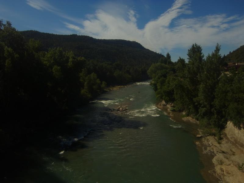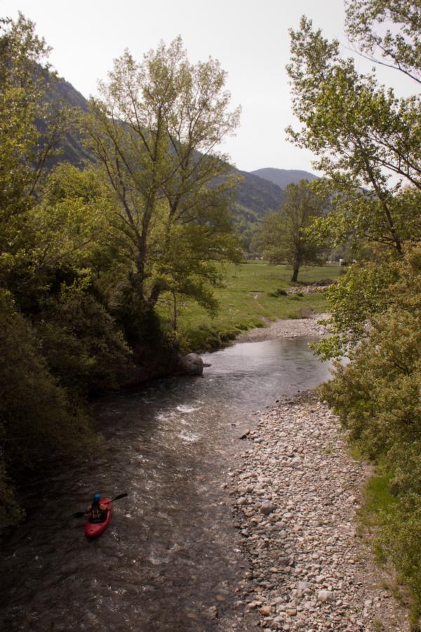 Fährt man das Garonnetal flussauf und dann durch einen Tunnel, landet man im Tal des Noguera Ribargorcana, der leider größtenteils mit Stauseen verbaut wurde. Auf einem kurzen Abschnitt lohnt sich eine Befahrung dennoch, wenn man genug Wasser hat. Das war bei uns leider nicht der Fall und so schrappelte ich zum größtenteil den Bach hinab. Man sollte sich icht von dem glasklaren Wasser täuschen lassen.