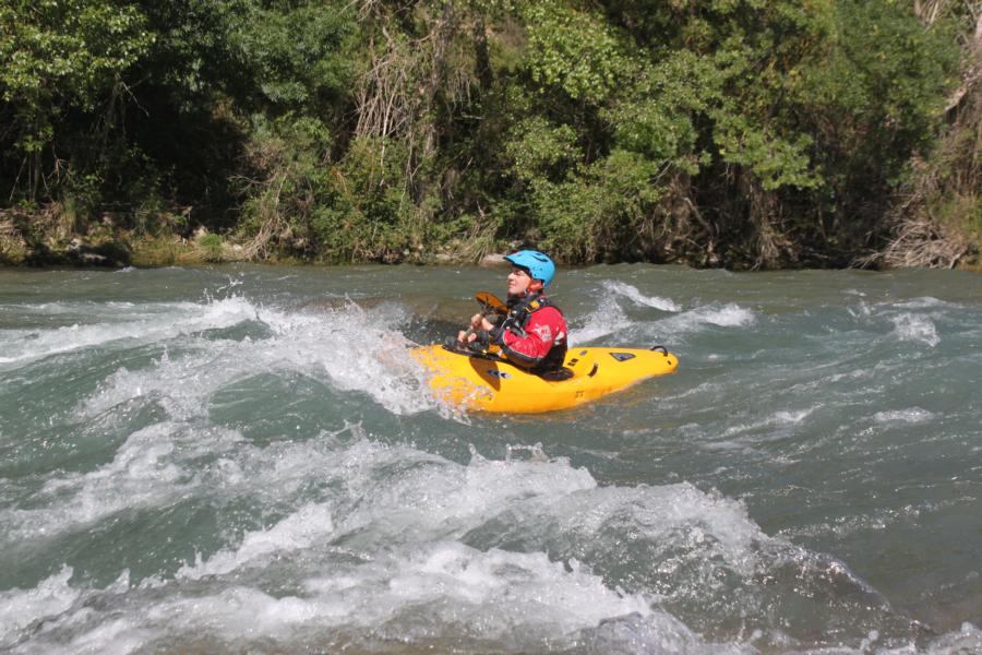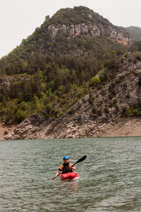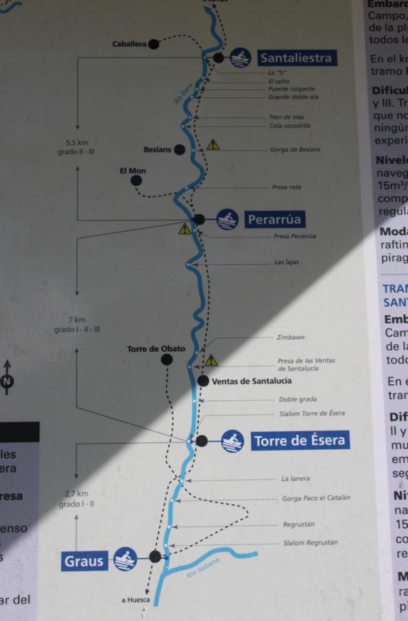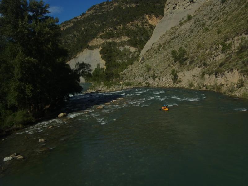Das wenige Wasser kam mir bei der Ortsduchfahrt von El Pont de Suert aber nur entgegen, da hier fünf Wehre mit teils tötlichen Rücklauf und nur beschränkten Umtragemöglichkeiten auf einen warten. Bei viel Wasser sicher gefährlich, bei wenig Wasser konnte man die meisten am Rand herunterrutschen oder auch noch umtragen. Nach dem Ort kommt ordentlich Wasser dazu, vom oberen Stausee oder den Nebenbächen. Da der untere Stausee noch nicht die volle Stauhöhe erreicht hatte, konnte ich den Noguera Ribargorcana auf zwei Kilometern so genießen, wie er wohl vor dem Eingriff der Menschen war: wasserreich und wuchtig, also sehr schön. Dafür musste ich dann noch ein kurzes Stück über den See bis zum Ausstieg paddeln, aber da war wenigstens genug Wasser da.