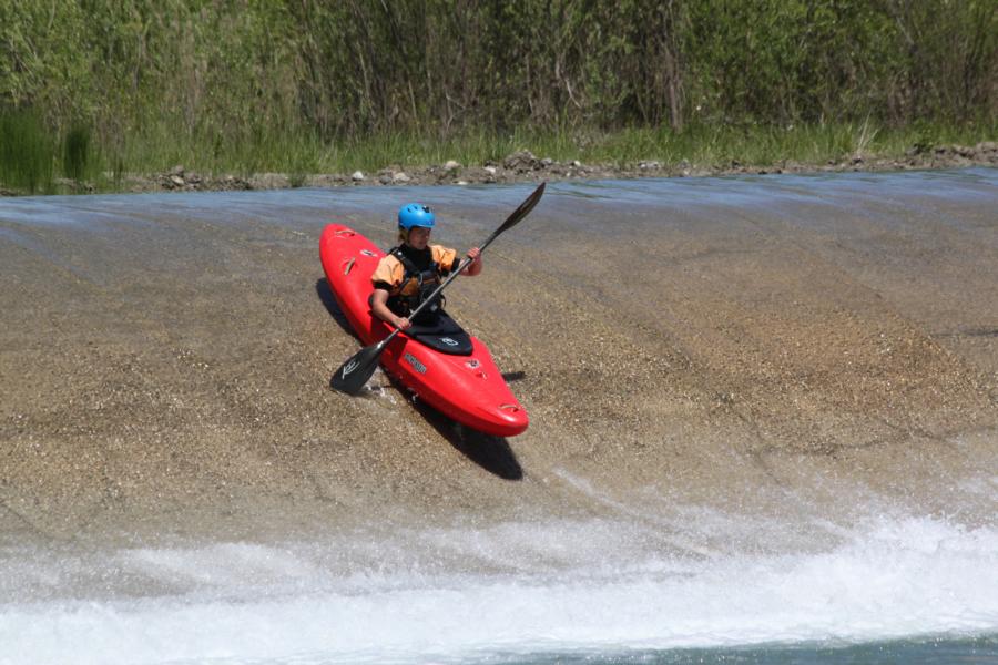 Doch schon der erste Schwall ging ordentlich runter: Wuchtiges WW III! Es gab keinen wirklichen Weg zu kneifen und so wurde Jakob bei mir vorne drin einmal gut getunkt. Samuel wurde auch nass, aber sein Neo und die Halbtrockenjacke halten doch mehr Wasser ab. In ähnlicher Manier ging es weiter, wuchtiger Schwall, Pause, wuchtiger Schwall, usw. Mal waren die Schwälle leicht und man konnte kneifen, mal musste man mittendurch.