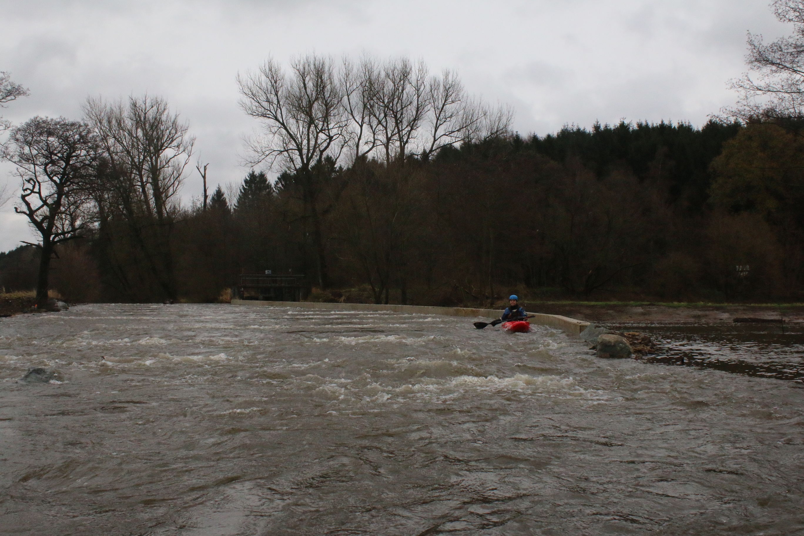 Die größte Änderung an der Möhne kommt dann vor Allagen: das Steilwehr wurde zurückgebaut und besteht nun aus unzähligen kleinen Stufen. Der ganze Fluss ist hier ziemlich breit. Wir sind bei einem Pegel von 83 cm gefahren und haben teilweise aufgesetzt. Vielleicht muss man den Mindestpegel mittlerweile eher auf 80 cm ansetzen, da es bei viel weniger Wasser wohl keinen Sinn mehr macht, dort zu paddeln. Vor allem, weil die Möhne unmittelbar nach dem Wehr auch noch sehr stark verbreitert wurde.