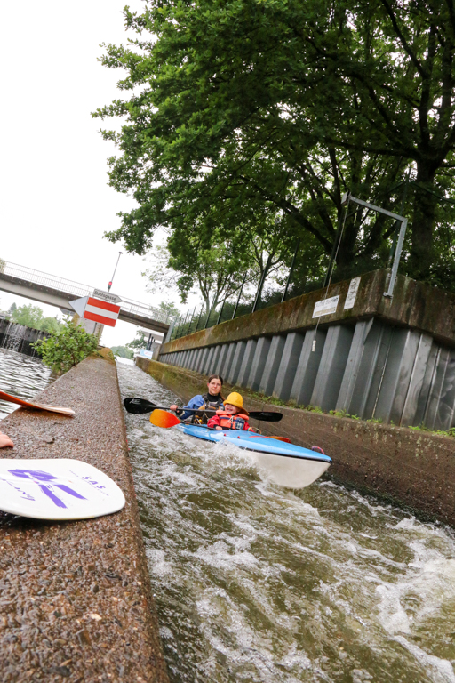 Im Regen machten wir unsere ersten Paddelschläge, was aber nicht weiter schlimm war, denn kalt war es nicht und die Kinder waren gut eingepackt. Kurz nach dem Start kommen relativ nah beieinander drei Wehre, die man über eine Bootsgasse jeweils gut umfahren kann. Besonders Jakob war von der ersten Gasse sehr angetan (wahrscheinlich sein Highlight der ganzen Tour), da man hier richtig schnell wurde.