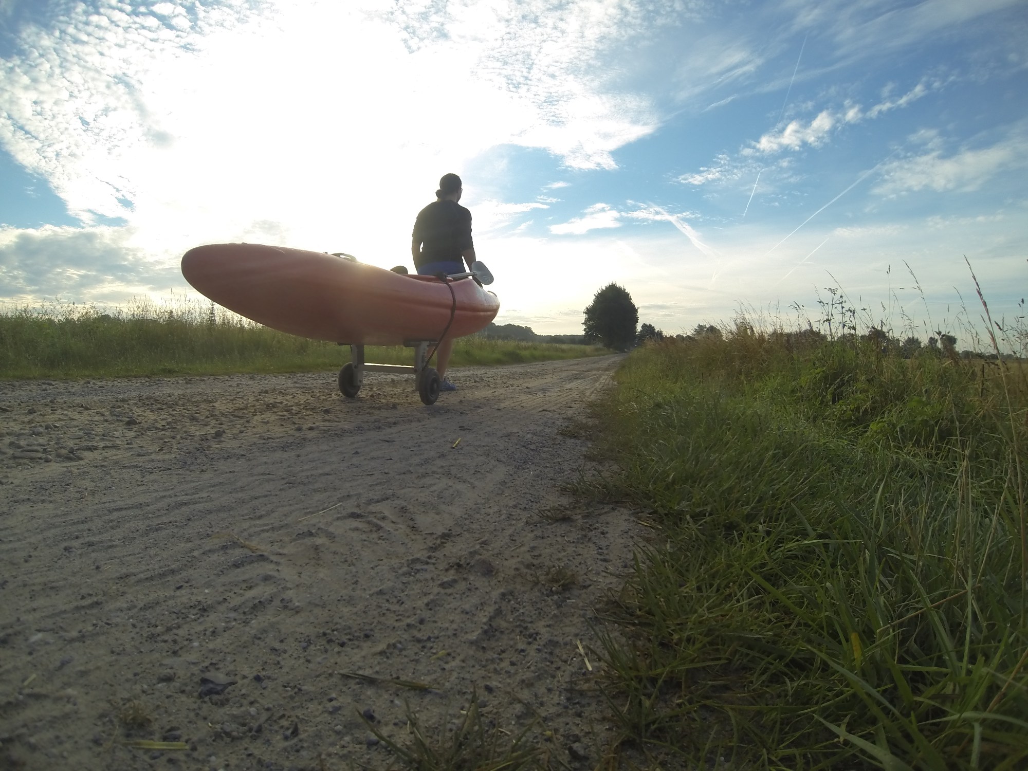 Ehrlich gesagt hatte ich schon länger mit dem Gedanken einer solchen Tour gespielt: mit dem Bootswagen vom Ausstieg aus am Fluss hochlaufen und dann wieder zurück paddeln. Aber ob das überhaupt gut hinhaut? Aus Angst vor einem totalen Reinfall, sollte ein Testlauf erstmal ohne Kinder stattfinden (die machen eh gerade Urlaub). Da Paul zur Zeit auch nicht zu Hause ist, war ich auf mich allein gestellt (Was Mütter halt so machen, wenn sie sturmfrei haben 😉 ).
