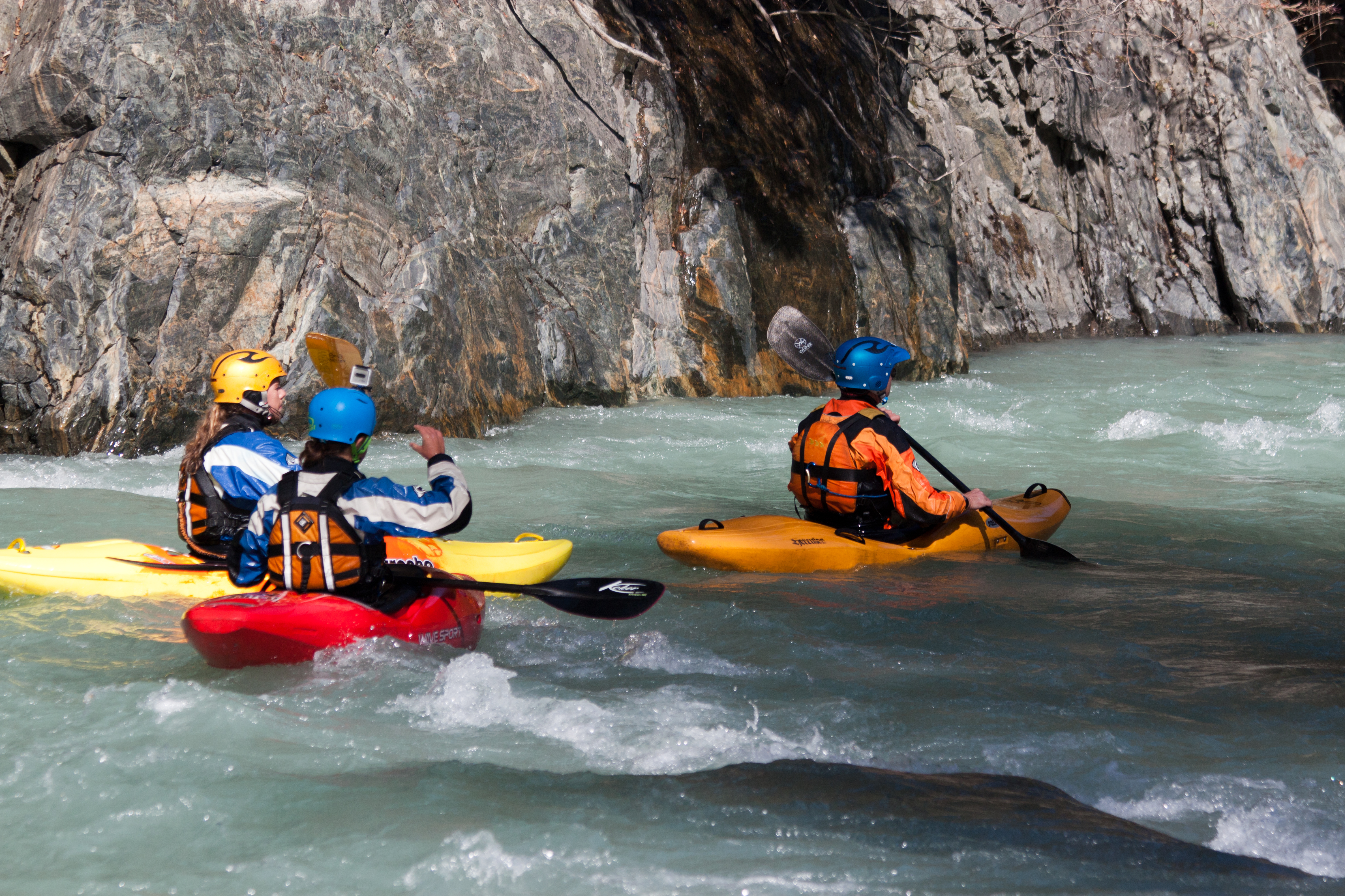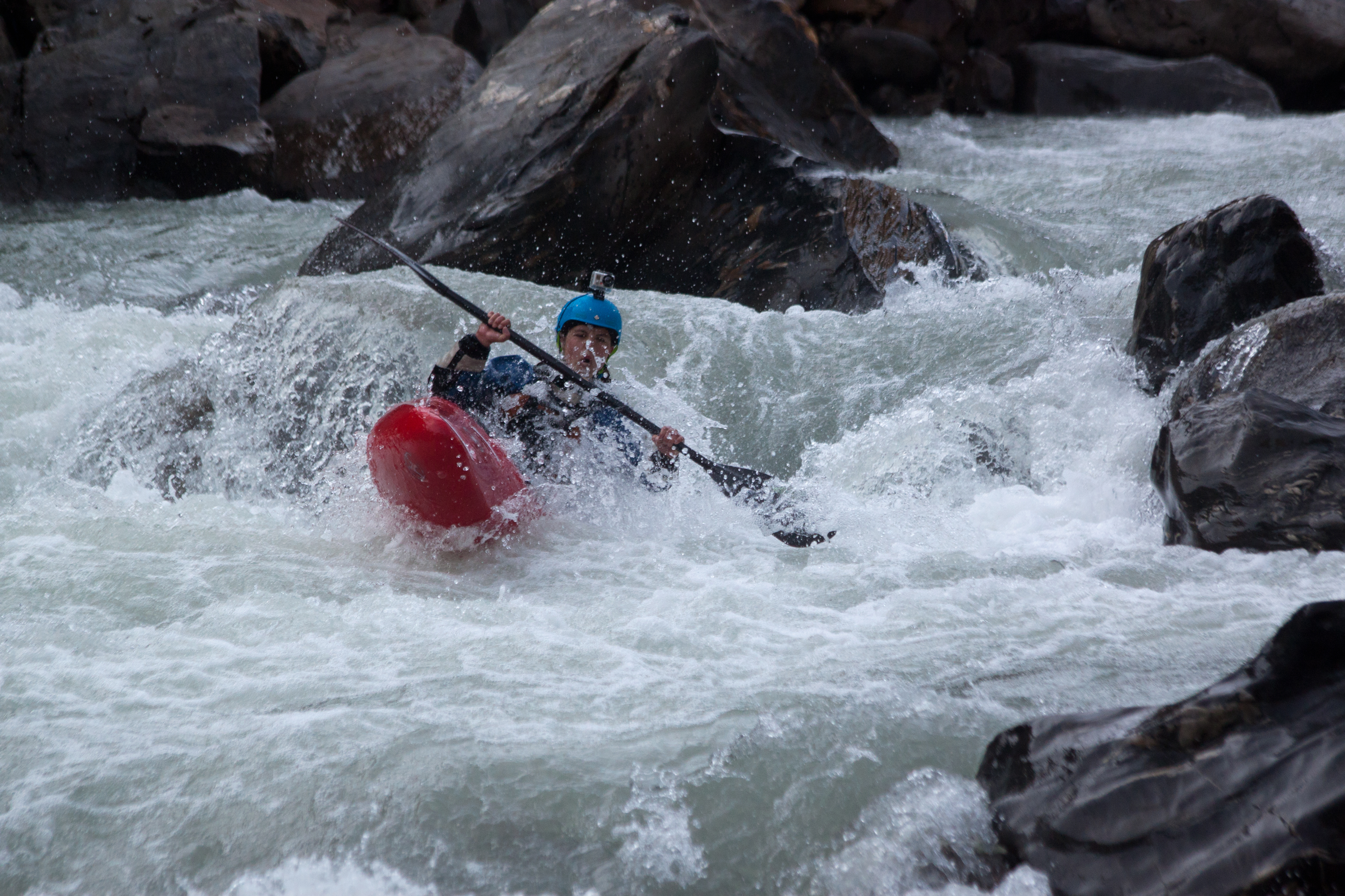 Nun wird die Venter Ache wieder etwas ruhiger, bis sie kurz vor dem Ausstieg noch mit einem kleinen Abfall in einer Linkskurve aufwartet. Dieser kleine Genusshüpfer ist ohne Schwierigkeiten zu fahren, hat allerdings schon den ein oder anderen „Venter-Neuling“ überrascht, da er etwas unvermittelt auftaucht. In Zwieselstein, am Zusammenfluss der Venter Ache und des Gurglbachs, beenden wir den ersten Abschnitt unserer Tour. Die nun folgende Kühtrain-Schlucht bietet extrem schweres Wildwasser mit einigen Siphonen, die teils nur schwierig zu umtragen sind.