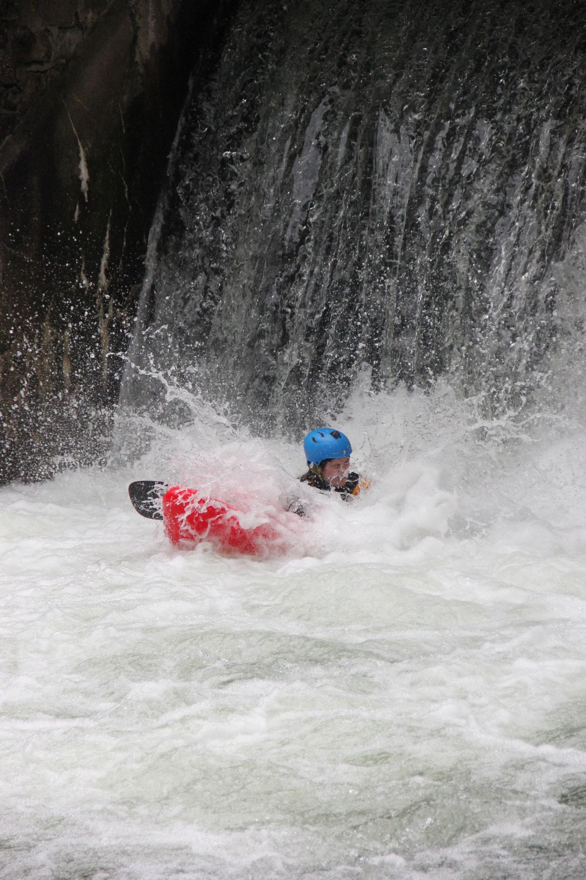 Nur wenige Kilometer von der Hundembachmündung entfernt, mündet die Veischede ebenfalls von der linken Seite in die Lenne. Zu Beginn recht kleinflusstypisch und ebenso anspruchsvoll, hat dieser kleine Graben noch eine Überraschung in petto: den Veischede-Katarakt. Am Eingang des kleinen Örtchens Bilstein heißt es dafür an einer Brücke rechts raus. Denn selbst wenn man den Katarakt schon kennt, kann ein verklemmter Baum hier besonders gefährlich werden. Direkt hinter der Brücke geht es über eine schräge Rutsche zunächst abwärts, ein flacheres Stück mit kleineren Walzen folgt, bevor der Katarakt in seinem Höhepunkt gipfelt: eine ungefähr zwei Meter hohe Stufe, die man besser booft, wenn man nicht von dem dicken Loch verschlungen werden möchte. Ein Umtragen ist, wenn auch umständlich, auf der rechten Seite möglich. Von dort aus sollte der Katarakt auch besichtigt werden, das linke Ufer ist Privatbesitz und die Anwohner sehen es nicht so gerne, wenn eine Horde Paddler durch die Gärten trampelt. Nach Bilstein wird die Veischede etwas offener und auch um einiges leichter, so dass ab hier schwächere Fahrer zusteigen können.