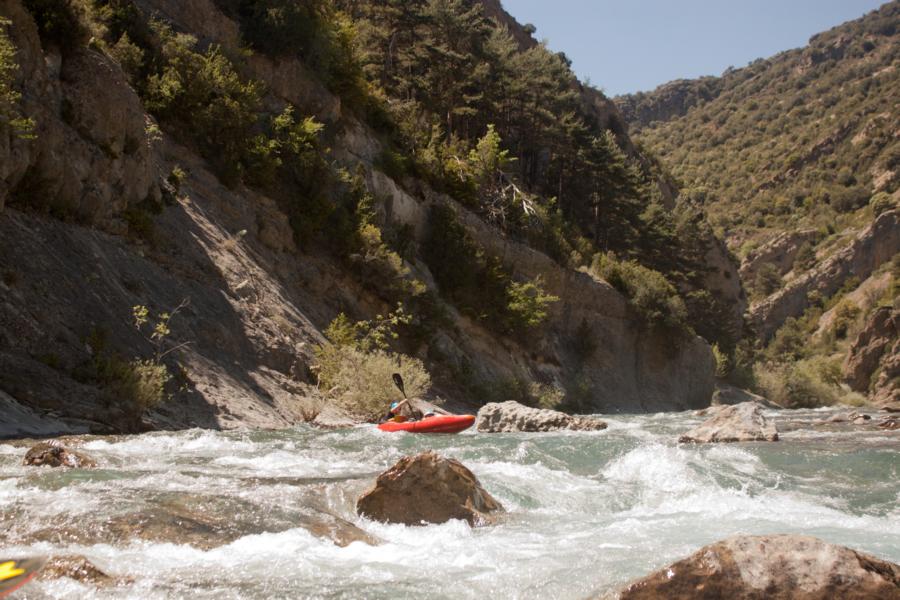 Auf diesem Abschnitt ist der Ara leichtes Wildwasser, WW II/II+ (bei höheren Wasserständen einige Stellen bis WW III) in Kiesbankschwällen. Einige Stellen haben leichte Verblockung. Erst paddelt man durch ein offenes, verlassen wirkendes Tal, dann geht es durch die Schlucht Garganta de Boltana. Weniger versierte Paddler sollten sich die Eingangsstelle der Schlucht unter der Hängebrücke anschauen. Hier zieht das wasser gegen den Brückenpfeiler.